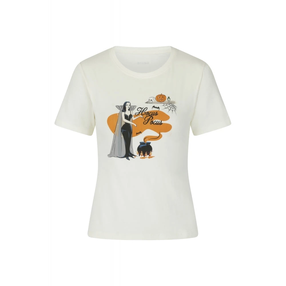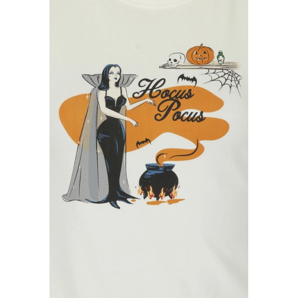 She’s a classic stretch cotton, cream coloured fitted tee with a stunning bespoke print design. She features a gothic beauty in a glorious cape and dress combo, casting a spell over her magical cauldron with a puff of orange smoke and “Hocus Pocus” slogan.