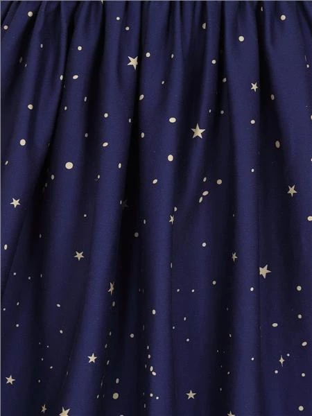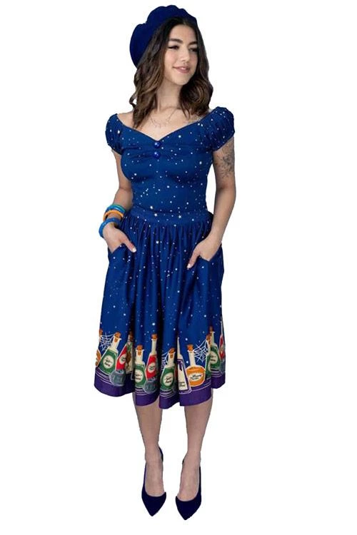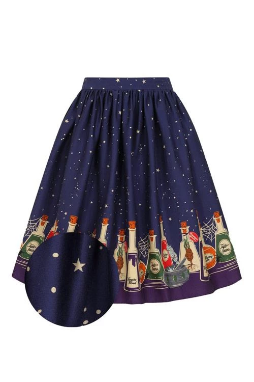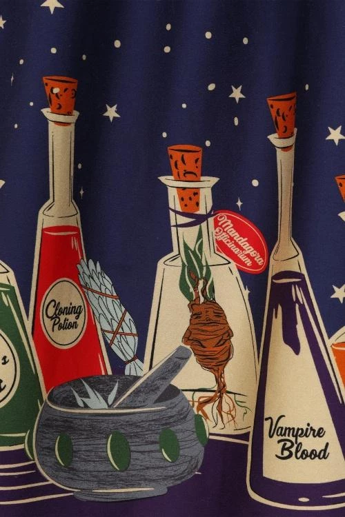Made of a firm, yet supple navy-blue cotton blend with a light stretch and a print of dots, stars and magic potions that is a joy to wear. This cutie is sure to put a spell on you!