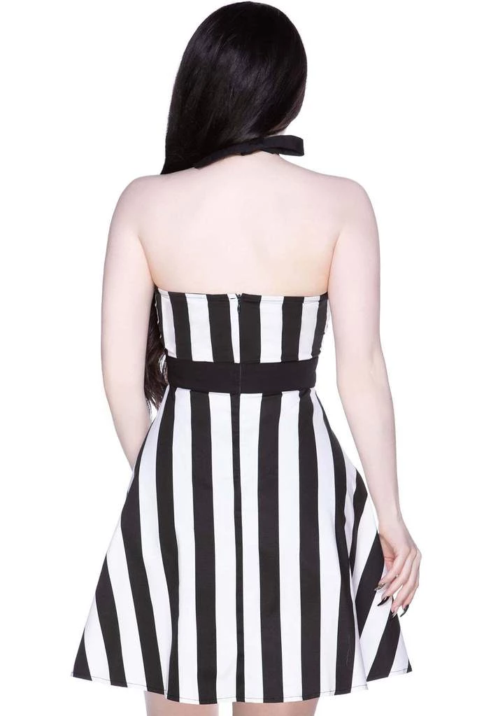 Look ghoulishly good in the ‘It’s Showtime’ dress; conjured using a super-stretch fabric which stretches to perfection for a flattering and comfortable fit. Features a low neckline with zip detailing, halter neck, flattering waistband and skater skirt. This gothic dress is a dream to style – perfect for a day out with the coven or picnics by the moon.