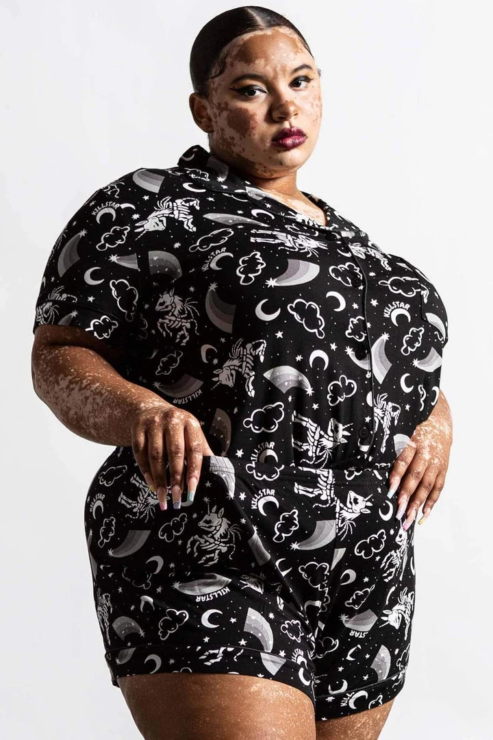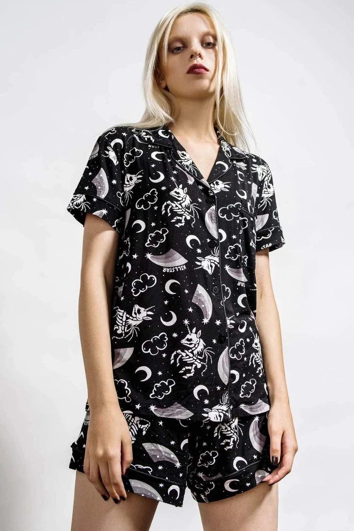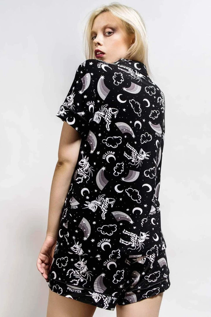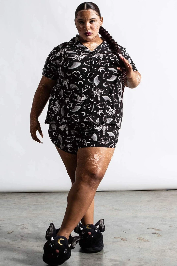 I’m so good at sleeping I can do it with my eyes closed! Rest easy in our ‘Moonbow’ PJ set. Made from a super soft material with just the right amount of stretch! Features matching shorts and top set, statement print all over and a button up front- the perfect fit for a movie marathon.