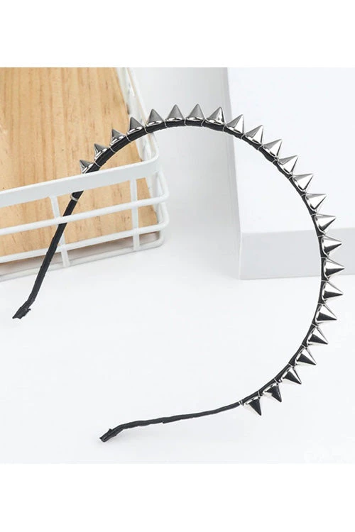 Plastic spikes on an alloy black ribbon wrapped headband. |