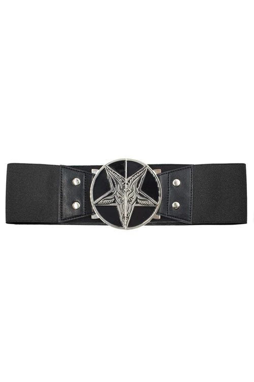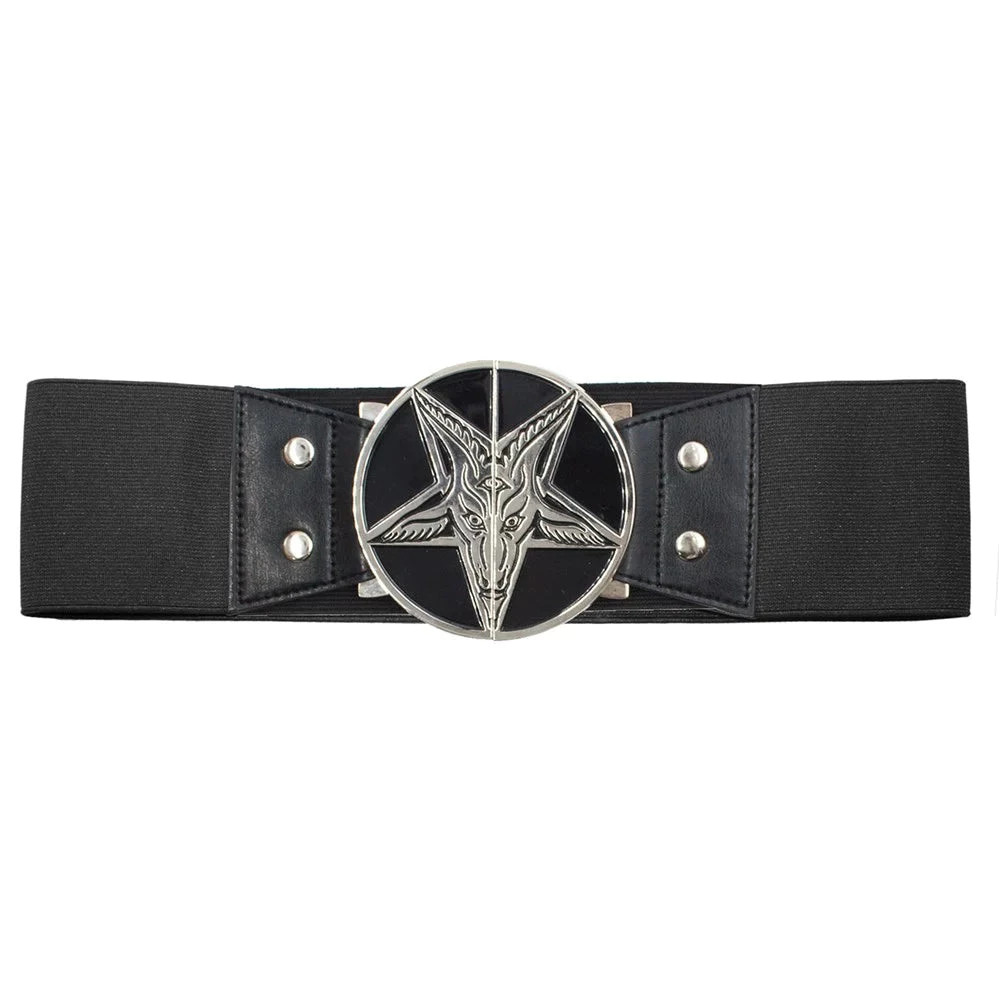 Red Goat Head elastic waist belt by kreepsville. Vintage style elastic waist belt with split buckle fastening. Three eyed goat head buckle on a red elastic waist belt. Add a touch of glamour ghoul to any outfit. Buckle when closed approx 5.4 in (14cm) wide.