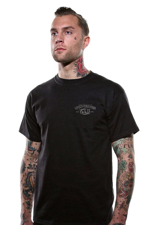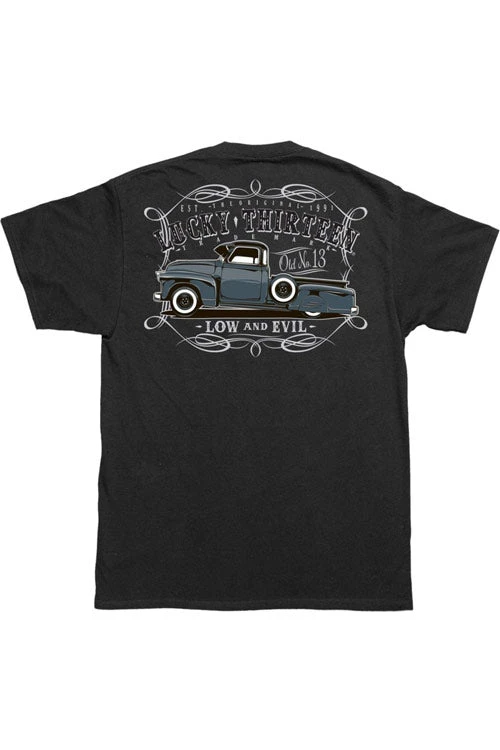 There is a full back print of the “Dragger” graphic of a classic pick up truck and pin-striping detail, and a front left chest print as well