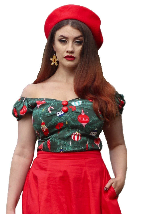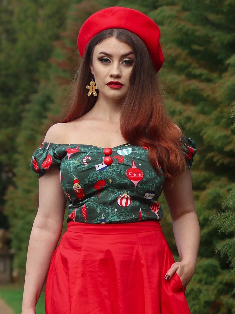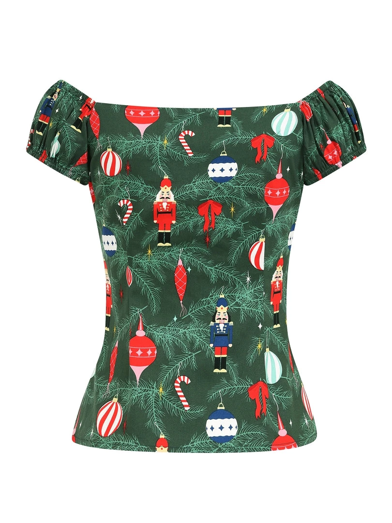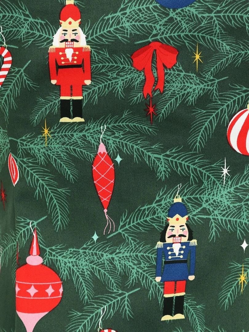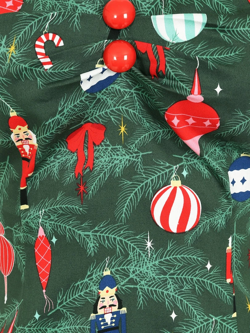 A festive take on a Collectif staple; this Dolores comes in luscious green and features a bespoke novelty print of Christmas ornaments, nutcrackers and subtle branch textures in the background!
