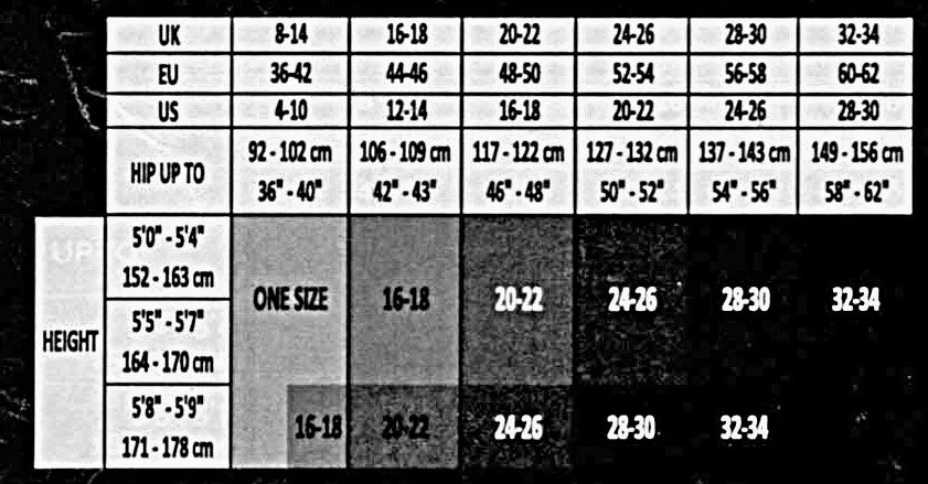 One size, 16 – 18, 20 – 22, 24 – 26 & 28 – 32